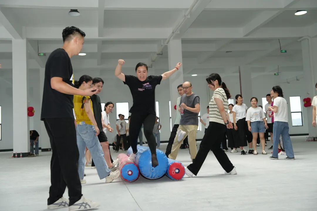 在教練帶領大家進行充分熱身之后,團建活動正式拉開序幕,6支團隊分別起了各具特色的隊名與振奮人心的口號,在“超級障礙賽”、“飛盤嘉年華”與“蒙眼博弈”等前三個競技游戲中,隊友奮力拼搏、相互團結協作,用耐心和智慧出色完成每個項目,對手之前本著“友誼第一、比賽第二”的體育精神,相互尊重,在充滿挑戰性和趣味性的活動中賽出了風格,賽出了水平。在最后一個“動力圈”游戲項目中所有人團結協作、配合默契,勇于挑戰的精神風貌充分展現了湘能楚天大家庭團結向上、銳意進取的昂揚斗志。整個活動現場氣氛活躍而又熱烈,每個人在揮灑汗水的同時,也享受了趣味運動帶來的樂趣,提升團隊的凝聚力和集體向心力的同時營造了溫馨、愉悅的企業文化氛圍,進而增強了員工對企業的歸屬感。我們在一起,就會了不起。<<<向左滑動欣賞更多精彩瞬間...